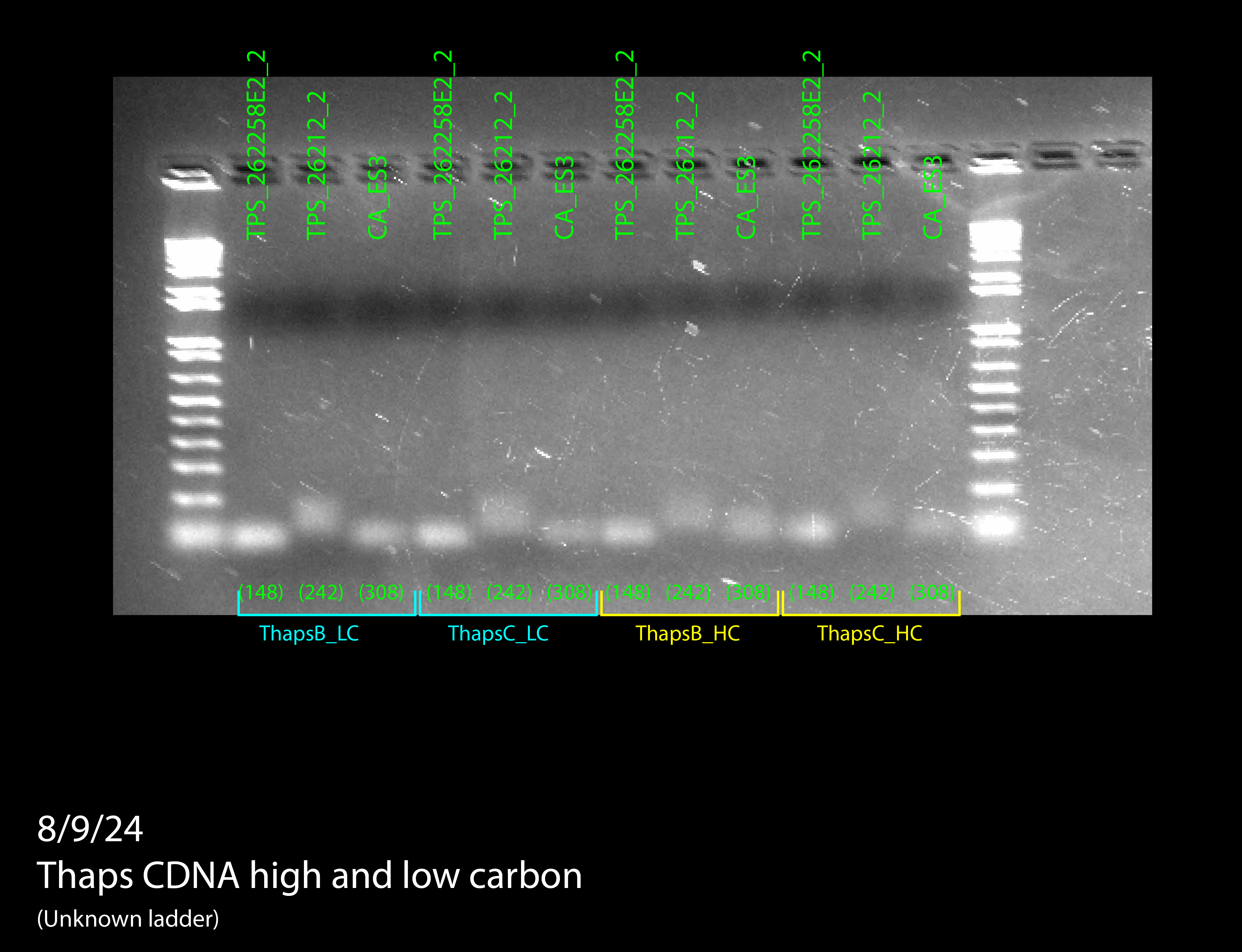 Phaeo grew very well and multiplied very quickly, however, we were not able to grow Frag successfully in high and low carbon conditions because it is an arctic diatom and we did not have the proper facilities to grow it at 4°C while controlling the carbon flow. We decided to continue with the experiment using DNA and RNA from the stock cultures we already had that were grown only in ambient carbon conditions in addition to the Thaps DNA and RNA..